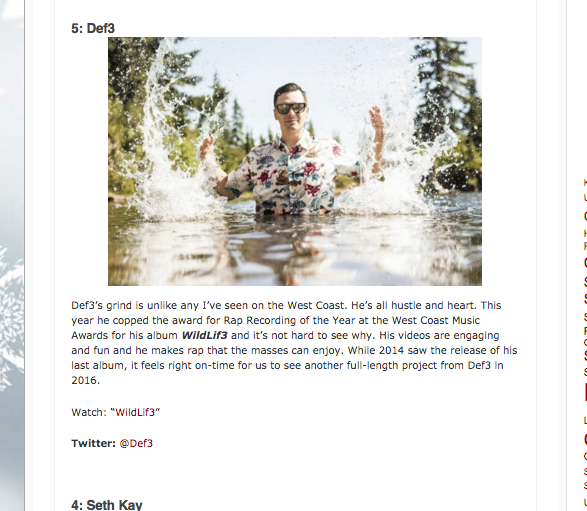 Thanks for putting me on your list! As for new album i am currently in the process of writing 2 albums at once and will be announcing there release dates in February so stay tuned. See the whole article here > 15 West Coast Artists to Watch in 2016