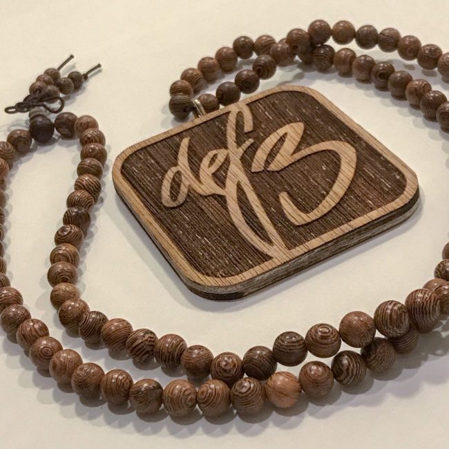 Looking for some dope festival swag? We’ve got you covered. This wood pendant is not only handmade by def3 himself but is also 2 sided so you’ll never have to worry about getting caught looking like a sucka with that thang turned backwards. The necklace contains polished Round beads (8mm) made of wenge wood (17″…