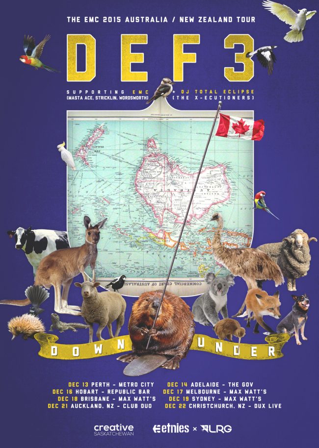 Excited to announce that Def3 will be joining the legendary EMC Crew (Masta Ace, Stricklin and Wordsworth) alongside DJ Total Eclipse of the X-ecutioners for their December 2015 Australian / New Zealand Tour! Big thanks to Andy Mcalpine for the awesome flyer design and Creative Sask for their support!